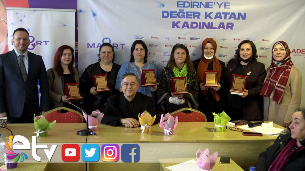 Saadet Partisi’nin toplantı salonunda gerçekleşen etkinlikte Edirne’ye değer katan kadınlara plaket takdim edildi. Bilim akademi sağlık kategorisinde Nazlı Yaçı, Girişimcilik ve Üretkenlik Kategorisinde Derya Akduman ve Nazmiye Kasap, Anne Kategorisinde Semra Acar,