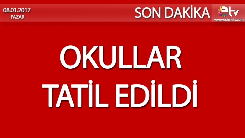09/01/2017 Pazartesi günü Edirne ili merkez ve ilçelerinde Milli Eğitim Müdürlüğüne bağlı tüm özel/resmi okullar ve kurumlar, kar/buzlanma nedeniyle 1 (Bir) gün tatil edilmiştir. Ayrıca kamu çalışanı engelli ve hamile personel 09/01/2017 Pazartesi günü 1(Bir) gün idari izinli sayılacaktır.