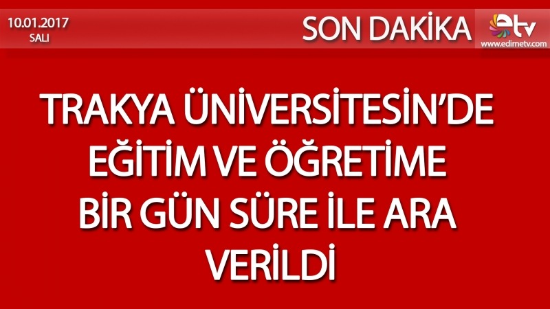 ÜNİVERSİTEMİZDE EĞİTİM VE ÖĞRETİME BİR GÜN SÜRE İLE ARA VERİLMİŞTİR Üniversitemiz Senatosunun almış olduğu karar doğrultsunda İlimizde yaşanan olumsuz hava koşulları nedeniyle Üniversitemizde (İlçelerimiz de dahil olmak üzere) eğitim ve öğretime 11 Ocak 2017 tarihi itibari ile bir gün süre ile ara verilmiştir. Öğrencilerimize ders ve sınav telafileri ilgili tarihler bağlı bulundukları dekanlıklar veya müdürlükler tarafından bildirilecektir. Ayrıca Üniversitemizde görev yapmakta olan hamile ve engelli bireyler de bir gün idari izinli sayılacaktır. Trakya Üniversitesi Rektörlüğü