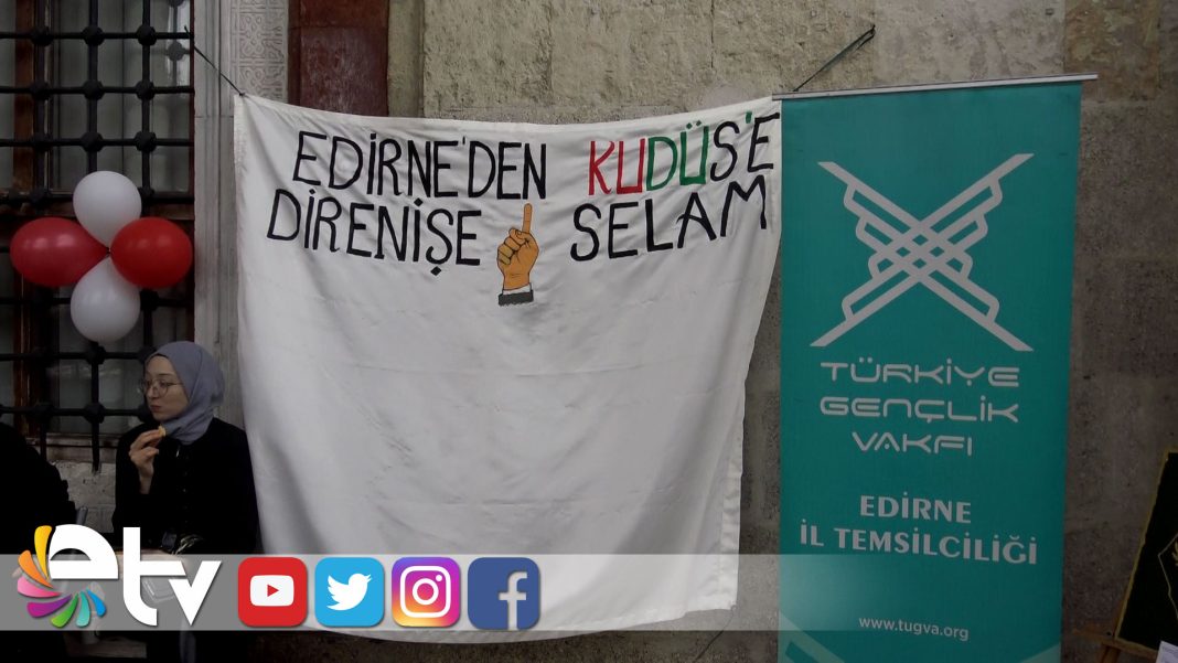 Edirne’de Eski Cami önünde Filistin’e destek olmak amacıyla resim sergisi ve kermes düzenlendi. Türkiye Gençlik Vakfı (TÜGVA) Edirne Temsilciliği tarafından düzenlenen etkinliklerin gelirleri de Filistin’e gönderilecek.