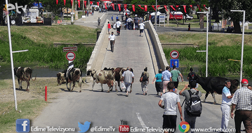 Tarihi Kırkpınar yağlı güreşlerinin yapıldığı Sarayiçi’nin davetsiz misafirleri vardı. Bir gurup inek, Sarayiçi’nin girişinden Tunca Nehrine geçerek serinlemeye çalıştı.