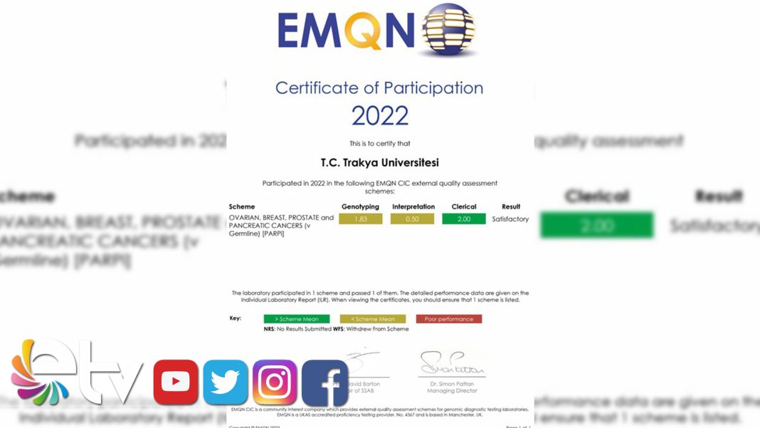 Trakya Üniversitesi Tıbbi Genetik Anabilim Dalı bünyesinde çalışmalarını sürdüren Genetik Hastalıklar Değerlendirme Merkezi; genetik testlerin analizlerinde Avrupa’da kalite konusunda önemli bir kuruluş olan European Molecular Genetics Quality Network tarafından yapılan değerlendirme sonucunda, Tatmin Edici olarak değerlendirildi.