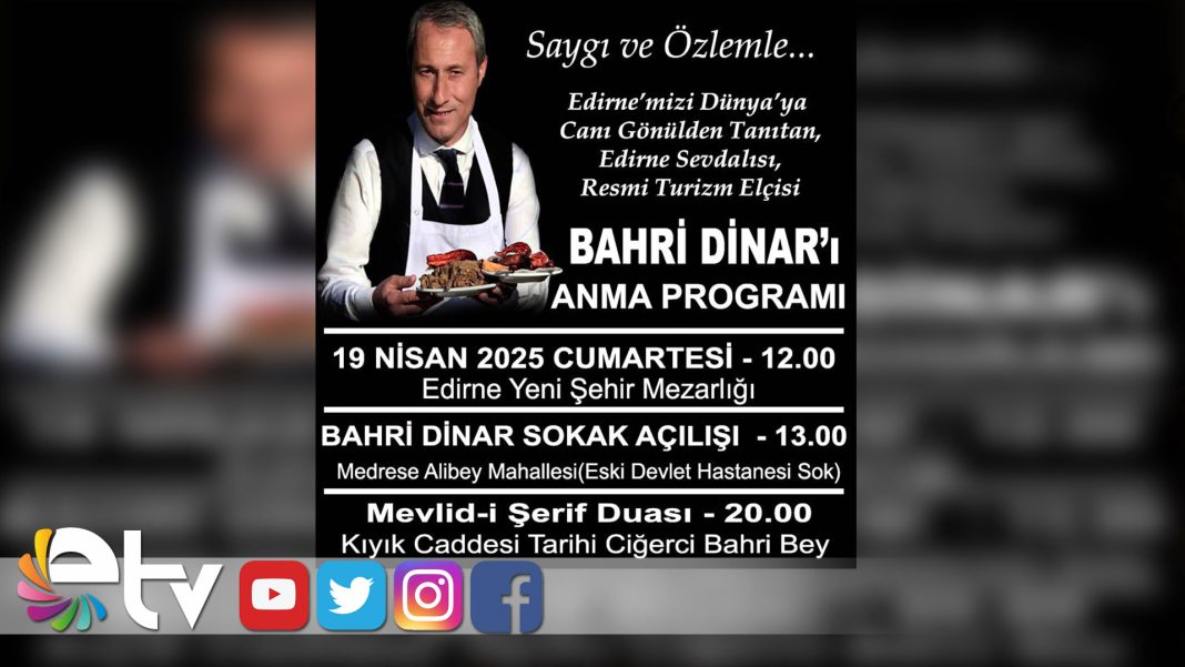 Dural, “Kelimelerin yetersiz kaldığı bu zamanda, ölüm yıl dönümünde merhum Bahri Dinar ağabeyimizi, özlemle ve rahmetle anacağız. Bahri ağabeyimizi, 19 Nisan Cumartesi günü saat 12.00 da Edirne Yenişehir Mezarlığı’ndaki kabri başında dualarla yad edeceğiz. Saat 13.00 da ise, Edirne Belediye Başkanımız Sayın Filiz Gencan Akın’ın da katılacağı programla Medrese Alibey Mahallemizdeki sokağın açılışını yapacağız. Akşam ezanı sonrasında da Kıyık Caddesi üzerinde bulunan Tarihi Ciğerci Bahri Bey işletmesinde Mevlid-i Şerif duasını yapacağız. Bahri ağabeyimizi seven tüm vatandaşları anma programımıza bekliyoruz.” dedi.