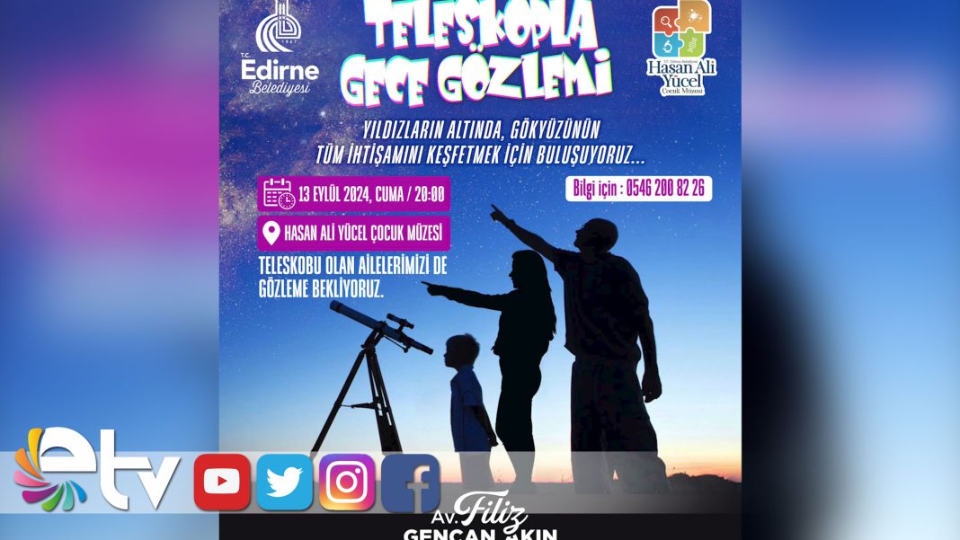 Edirne Belediyesi Hasan Ali Yücel Çocuk Müzesi’nde ‘Teleskopla Gece Gözlemi’ yapılacak. “Çocuklarımızı bilimle buluşturmak, onlara bilimin ışığında unutulmaz deneyimler sunmak istiyoruz” diyen Edirne Belediye Başkanı Av. Filiz Gencan Akın, tüm çocukları ve ailelerini etkinliğe davet etti.