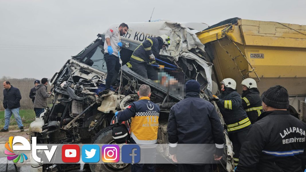 Edirne’nin Lalapaşa ilçesinde iki hafriyat kamyonunun çarpışması sonucu meydana gelen kazada bir sürücü araç içinde sıkışarak hayatını kaybetti.