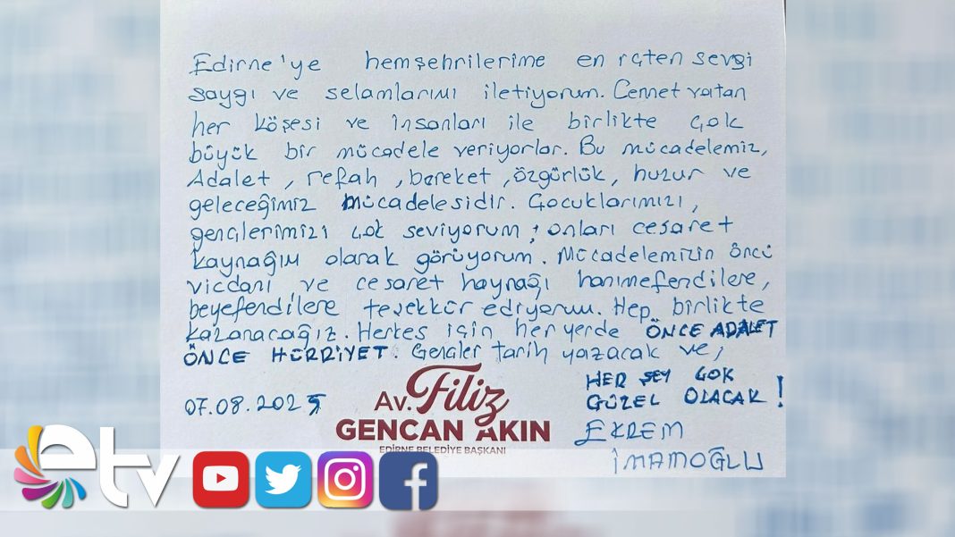 Edirne Belediye Başkanı Av. Filiz Gencan Akın, Marmara Cezaevi’nde tutuklu bulunan CHP’nin Cumhurbaşkanı Adayı Ekrem İmamoğlu’nu ziyaret etti. İmamoğlu, Gencan Akın vasıtasıyla Edirnelilere selamlarını iletti.Edirne Belediye Başkanı Av. Filiz Gencan Akın, CHP’nin Cumhurbaşkanı Adayı Ekrem İmamoğlu’nu tutuklu bulunduğu Marmara Cezaevi’nde ziyaret etti. İmamoğlu, el yazısı ile hazırladığı mesajının Gencan Akın vasıtasıyla Edirnelilere iletilmesini istedi.