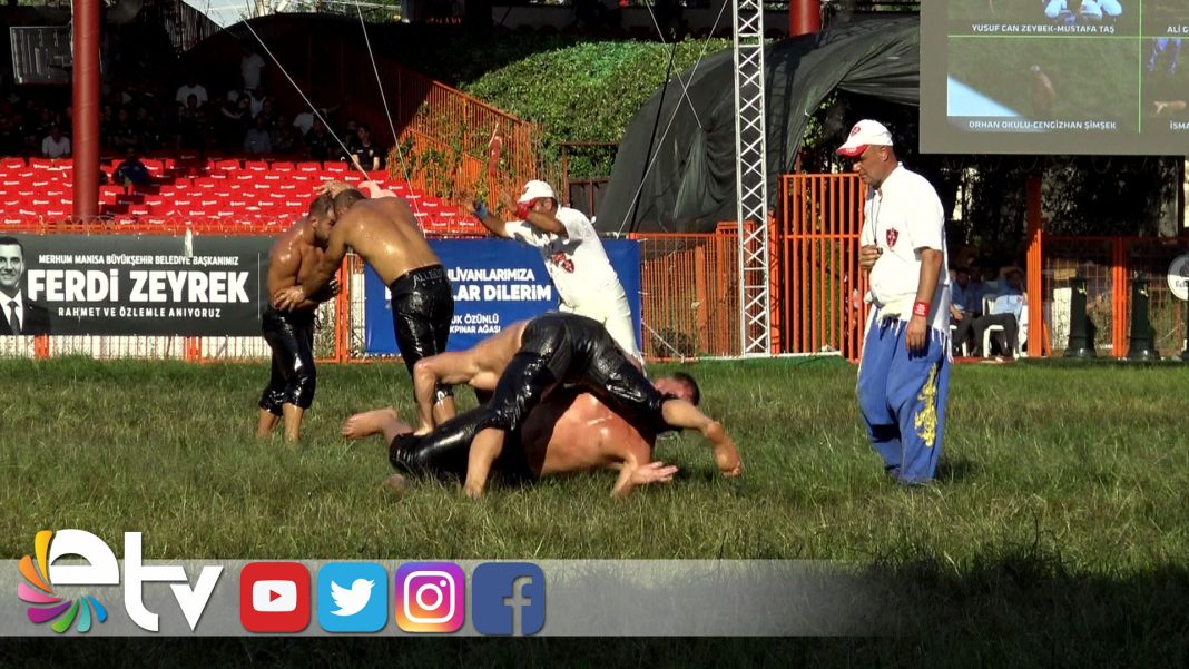 Tarihi Kırkpınar Yağlı Güreşleri üçüncü tur müsabakalarında İsmail Balaban’ın, Nedim Gürel’i yendiği an.
