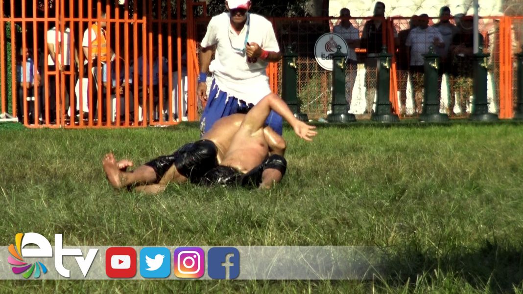 Tarihi Kırkpınar Yağlı Güreşleri üçüncü tur müsabakalarında İsmail Koç’un, Serdar Yıldırım’ı yendiği an.