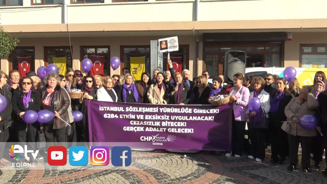 25 Kasım Kadına Yönelik Şiddetle Uluslararası Mücadele Günü nedeniyle Cumhuriyet Halk Partisi Edirne Kadın Kolları tarafından basın açıklaması gerçekleştirildi. Saraçlar Caddesi’nde düzenlenen basın açıklamasına; Edirne Belediye Başkanı Av. Filiz Gencan, CHP Edirne Kadın Kolları ve İl Genel Meclisi Başkanı Çiğdem Gegeoğlu, ilçe belediye başkanları, CHP Merkez İlçe Kadın Kolları Başkanı Burcu Birgül Çolak ve çok sayıda partili katılım gösterdi.