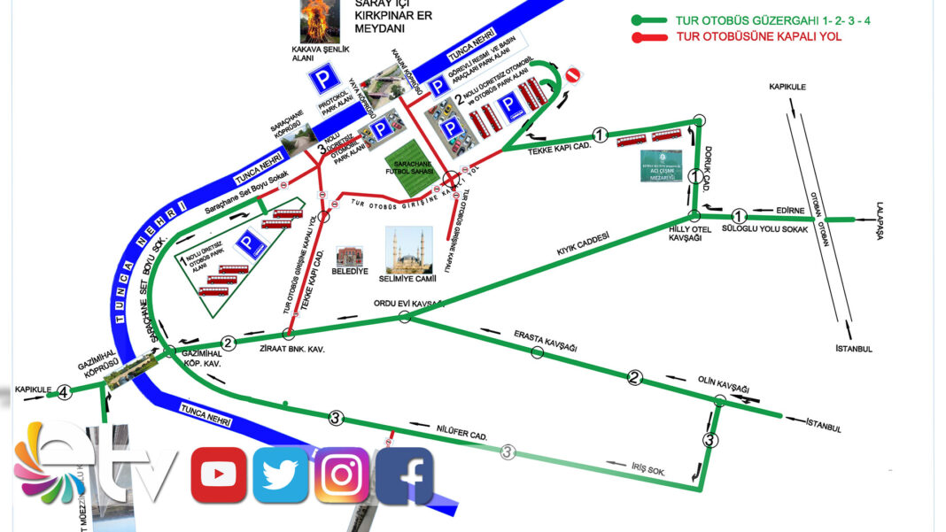 Şehir Merkezinden, Güney Çevre Yolundan Gelecekler; Olin Kavşağı İriş Sokak-Sedde Yolu Sok istikametinden Atatürk Bulvarını Karşıya geçerek (Şehir Merkezi ve Kapıkule İstikameti kullanılmayacak) Set Boyu Sokak üzerinden zorunlu otobüs park alanında otobüs parklanması, yolcu indirme ve bindirmesi yapacaklardır.