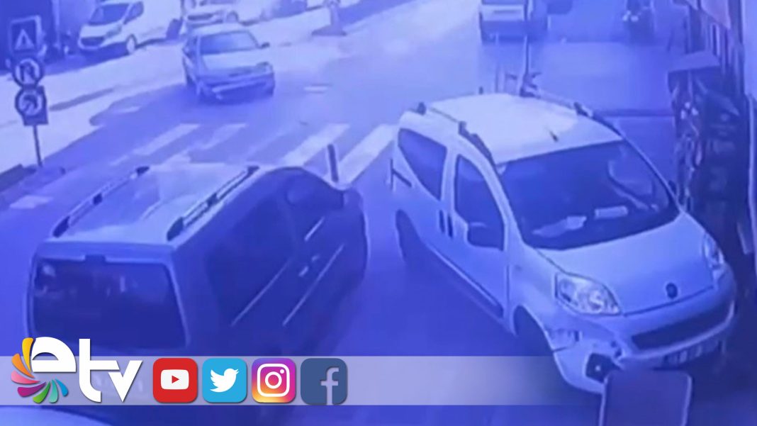Çarpışmanın etkisiyle direksiyon hakimiyetini kaybeden G.T. kontrolündeki hafif ticari araç, park halindeki otomobillere ve bir fırının duvarına çarparak durabildi. Kazanın yaşandığı anlar ise bir iş yerinin güvenlik kamerası tarafından saniye saniye kaydedildi.