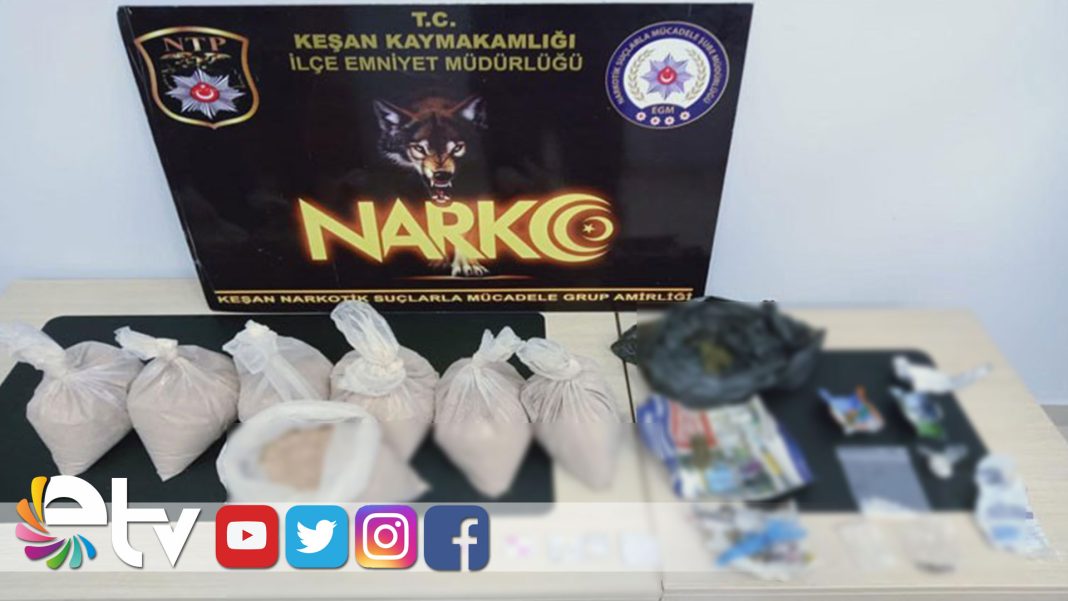 Keşan İlçe Emniyet Müdürlüğü Narkotik Suçlarla Mücadele Grup Amirliği ekipleri, Yenimescit Mahallesi Fidan Sokak üzerindeki bir adrese baskın düzenledi. U.K. ve Ö.K. isimli şahıslara ait evde ve kömürlükte yapılan aramalarda; 6 kilo 400 gram eroin, 15.53 gram esrar, 8.58 gram metamfetamin, 7.21 gram kenevir tohumu, kağıda sarılı vaziyette 6.05 gram esrar, 11 adet sentetik ecza ile birlikte Suçtan elde edildiği değerlendirilen toplam 9 bin 625 TL para ele geçirildi.