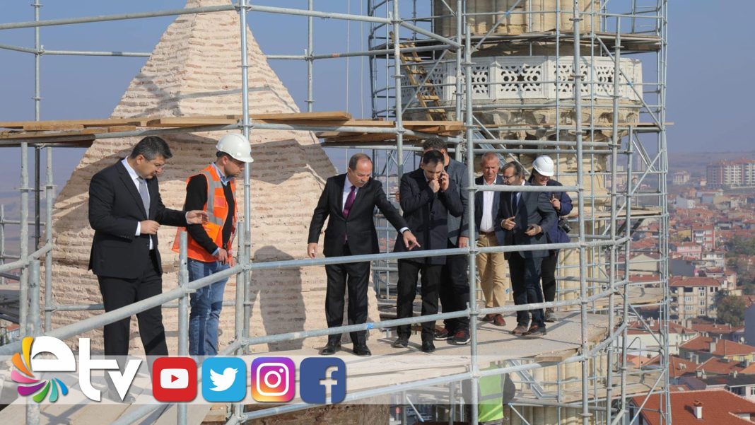 Mimar Sinan’ın ustalık eseri Selimiye Camii’nde restorasyon çalışmaları aralıksız sürüyor. Edirne Valisi Hüseyin Kürşat Kırbıyık ve Edirne Belediye Başkanı Recep Gürkan, Selimiye Camii’ne kurulan iskeleye çıkarak, çalışmaları yakından inceledi.