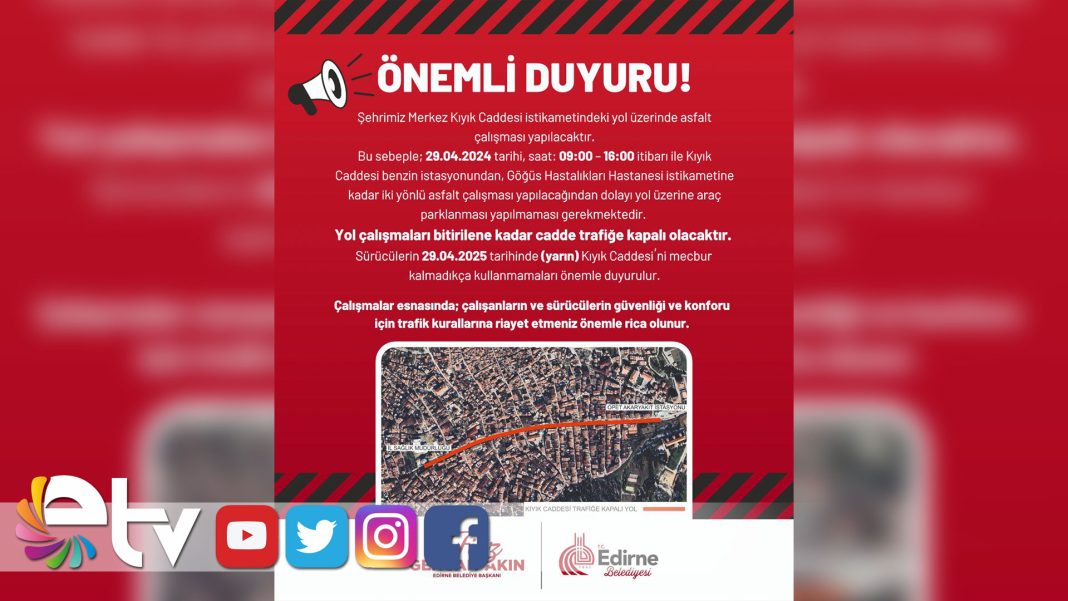 Edirne Belediyesi Ulaşım Hizmetleri Müdürlüğü, Kıyık Caddesi’nde yapılacak olan asfaltlama çalışması nedeniyle caddenin 7 saat süreyle trafiğe kapalı olacağını duyurdu.
