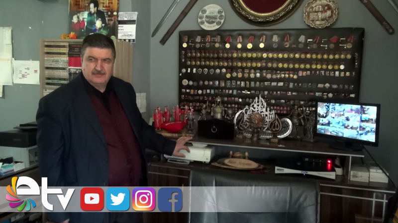 Yediyol Ağzı Caddesi’nde yıllardır kasap ve ciğerci dükkânında hizmet veren Hasan Hüseyinca biblo ve madalya koleksiyonunu çalışma ofisinde muhafaza etti.