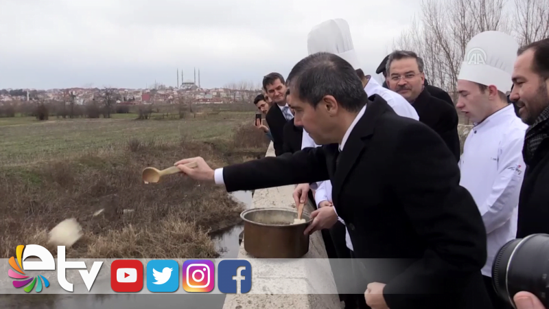 Konuşmaların ardından törene katılanlar Tunca Nehri kenarındaki sedde üzerinden yürüyerek Yalnızgöz Köprüsü'ne geldi. Aşçı adayları öğrenciler ve törene katılanlar kazandaki pilavı tahta kaşıkla nehre serpti.