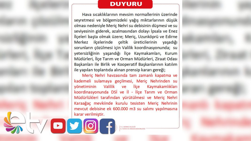 “Hava sıcaklıklarının mevsim normallerinin üzerinde seyretmesi ve bölgemizdeki yağış miktarlarının düşük olması nedeniyle Meriç Nehri su debisinin düşmesi ve su seviyesinin giderek azalmasından dolayı İpsala ve Enez ilçeleri başta olmak üzere; Meriç, Uzunköprü ve Edirne Merkez ilçelerinde çeltik üreticilerinin yaşadığı sorunların çözülmesi için Valilik koordinasyonunda; su yetersizliğinin yaşandığı İlçe Kaymakamlıkları, Kurum Müdürleri, İlçe Tarım ve Orman Müdürleri, Ziraat Odası Başkanları ile Birlik ve Kooperatif Başkanlarının katılımıyla yapılan toplantıda alınan prensip kararı gereği; Meriç Nehri havzasında tam zamanlı kapatma ve kademeli sulamaya geçilmesi, Meriç Nehri’nden su yönetiminin Valilik ve İlçe Kaymakamlıkları koordinasyonunda DSİ ve İl-İlçe Tarım ve Orman Müdürlükleri tarafından yürütülmesi ve Meriç Nehri Karaağaç mevkiinde kurulu tesisten Meriç Nehri’nin mevcut debisine ek 600 bin mekreküp su salımı yapılmasına karar verilmiştir.”
