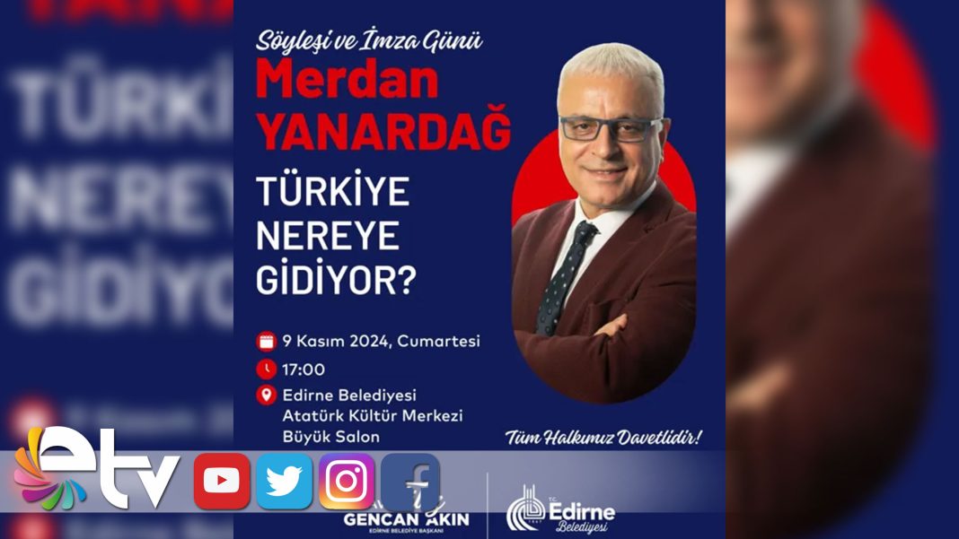 Tele1 Genel Yayın Yönetmeni, gazeteci ve yazar Merdan Yanardağ, “Türkiye Nereye Gidiyor?” başlıklı söyleşisi ve imza günü etkinliğiyle 9 Kasım Cumartesi günü Saat 17.00’de Atatürk Kültür Merkezi ve Belediye Konservatuarı’nda Edirnelilerle bir araya gelecek.