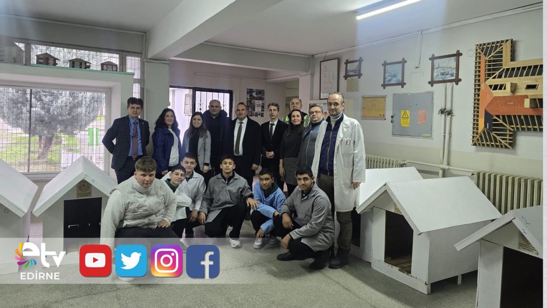 Edirne’de meslek lisesi öğrencileri, Sıfır Atık Projesi kapsamında atık malzemelerden ürettikleri kulübeleri sokak hayvanları için barınağa teslim etti.