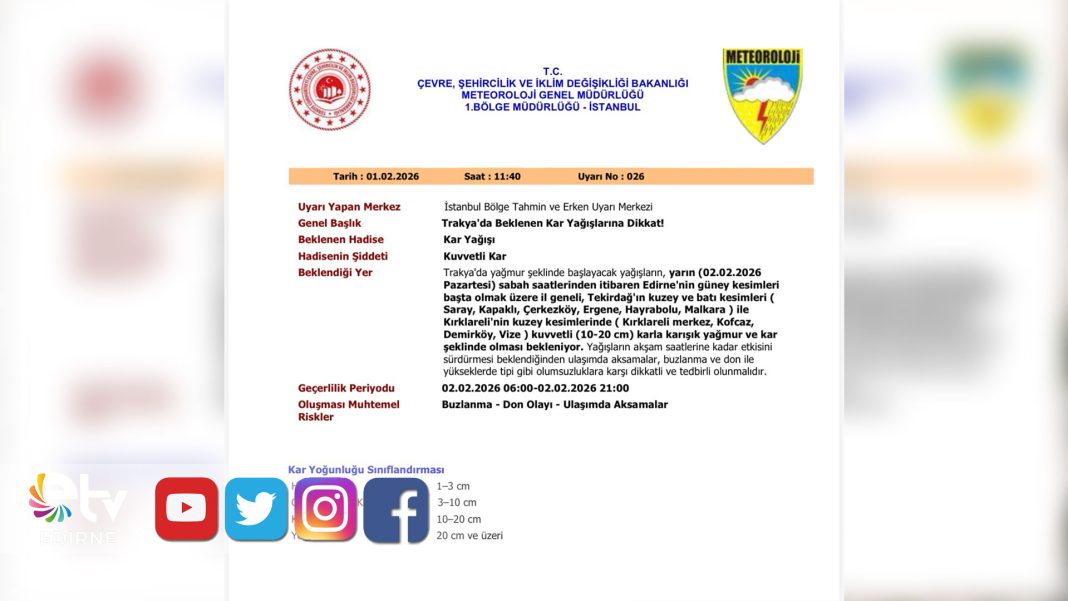 Uyarıya göre; Trakya’da yağmur şeklinde başlayacak yağışların, yarın sabah saatlerinden itibaren etkisini artırarak karla karışık yağmur ve kar şeklinde görülmesi bekleniyor. Yağışların özellikle Edirne’nin güney kesimleri başta olmak üzere il genelinde etkili olacağı bildirildi.