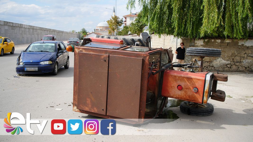 Edirne’de otomobil ile çarpışan traktör yan yattı.