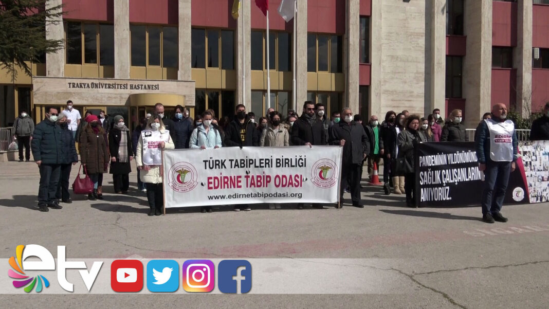 Dünya Sağlık Örgütü’nün koronavirüs pandemisini ilan ettiği ve Türkiye’de ilk COVID-19 vakasının açıklandığı 11 Mart 2020 tarihinin ikinci yıldönümünde Edirne’de bir araya gelen sağlık çalışanları, pandemide hayatını kaybeden hekimler ve sağlık çalışanlarını andı.