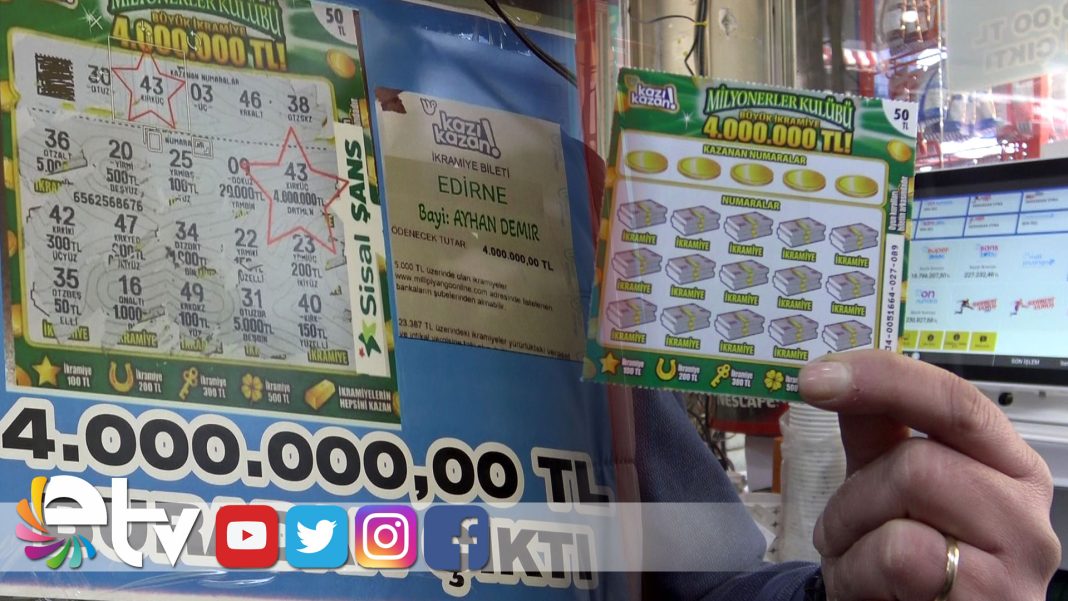 Edirne’de bir vatandaş, Sabuni Mahallesi’nde bulunan bir büfede 3 kuponluk kazı kazan oynadı. Kazıdığı kuponlardan ikramiye çıkmayan vatandaş, büfe sahibi Ayhan Demir’den tütün ürünü satın alarak gitmek istedi. Büfe sahibi Demir, vatandaşa para üstü olarak bir kazı kazan daha vermeyi önerdi. Öneriyi kabul ederek para üstü olarak kazı kazan kuponu alan vatandaş, 4 milyon TL kazandı. Talihli vatandaş kuponu teyit ettirdikten sonra büfeden ayrıldı.