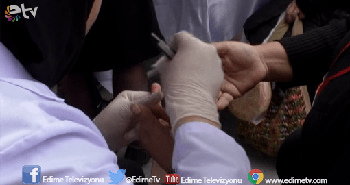 Edirne’de 14 Kasım Dünya Diyabet Günü dolayısıyla gerçekleştirilen etkinliğe yoğun ilgi gösteren vatandaşlar şeker ölçümlerini yaptırmak için cadde ortasında kurulan çadırın önünde sıraya girdi.