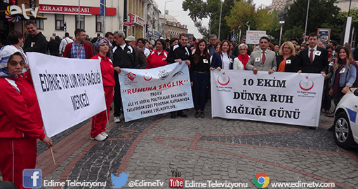 10 Ekim Dünya Ruh Sağlığı günü nedeniyle Edirne’de farkındalık etkinliği düzenlendi. Atatürk Anıtı önünde yapılan etkinlikte açıklama yapan Psikiyatri Uzmanı ve Toplum Ruh Sağlığı Merkezi Sorumlu Hekimi Mehtap Tıpız, 2011 yılından beri Edirne’de toplum ruh sağlığı merkezini faaliyetini sürdürdüğünü belirterek, şu anda kayıtlı 485 hastaları olduğunu, günlük 25 hastanın tedavi gördüğünü söyledi.