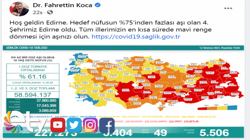 “Hoş geldin Edirne. Hedef nüfusun %75'inden fazlası aşı olan 4. Şehrimiz Edirne oldu. Tüm illerimizin en kısa sürede mavi renge dönmesi için aşınızı olun.” İfadelerini kullandı.