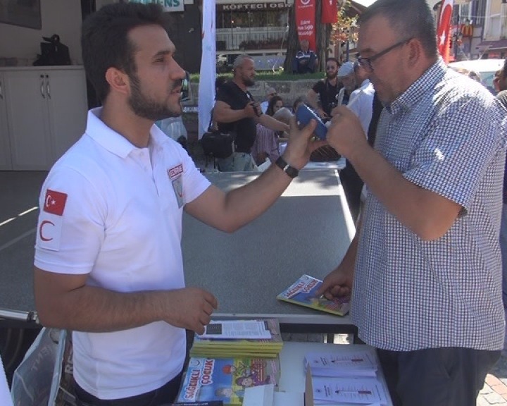 3-9 Eylül arasında kutlanan Halk Sağlığı Haftası kapsamında Saraçlar Caddesi’nde kurulan standlarda görevli sağlık personeli tarafından tansiyon, şeker ve karbonmonoksit ölçümü yapılıyor. Bilgilendirici broşür ve ücretsiz elma ikram edilen standa vatandaşların ilgisi büyük.
