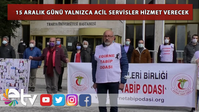 Sağlık çalışanları, Türk Tabipler Birliği öncülüğünde 15 Aralık’ta greve gidiyor. Edirne Tabip Odası’ndan konuyla ilgili yapılan açıklamada, “15 Aralık Çarşamba günü acil sağlık hizmetleri dışında bir hizmet verilmeyecek. Halkımıza acil sağlık durumları dışında sağlık kurumlarına başvurmayın çağrısında bulunuyoruz.” ifadeleri kullanıldı.