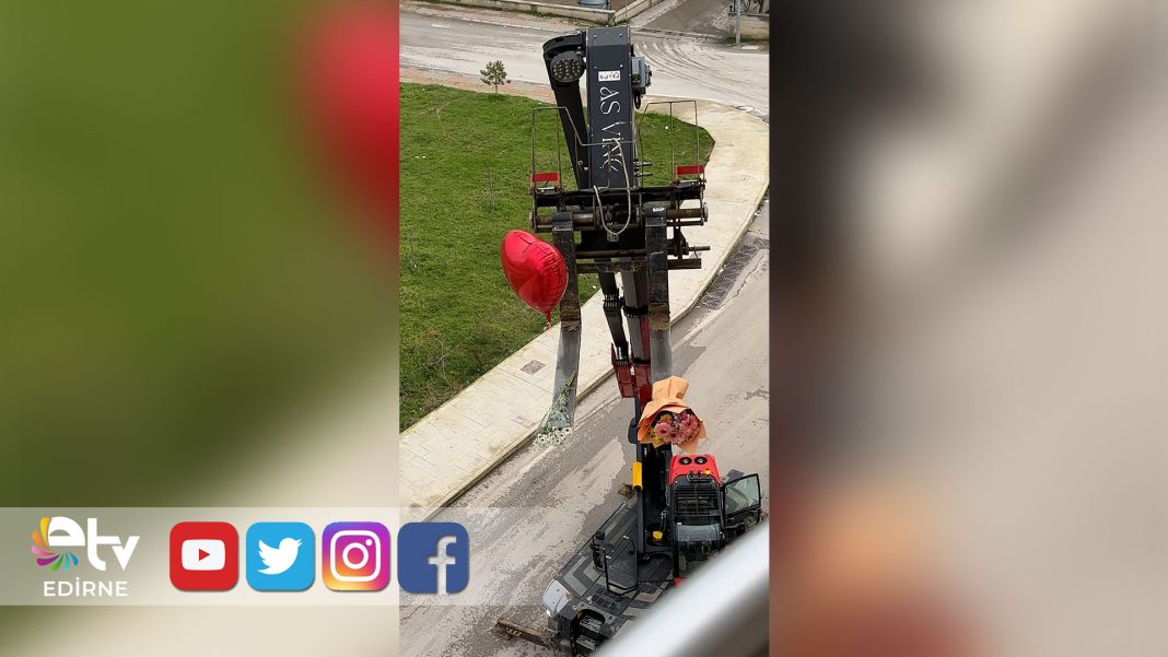 Edirne’de yaşayan kepçe operatörü Sefa Kurt, Sevgililer Günü’nü unuttuğunu fark edince eşinin gönlünü almak için sıra dışı bir yönteme başvurdu. İş makinesinin ucuna bağladığı gül buketi ve balonu balkona uzatan Kurt’un sürprizi renkli görüntüler oluşturdu.