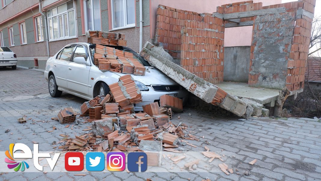 Edirne’de şiddetli rüzgar nedeniyle kullanılmayan bir evin duvarı, park halindeki otomobilin üzerine yıkıldı.
