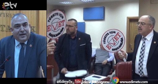Bunun üzerine grup odasından ‘Evet’ yazılı dövizleri getiren Ak Parti İl Genel meclis Üyesi Nedret Akbulut, grup sıralarına evet yazılı dövizleri dağıttı.
