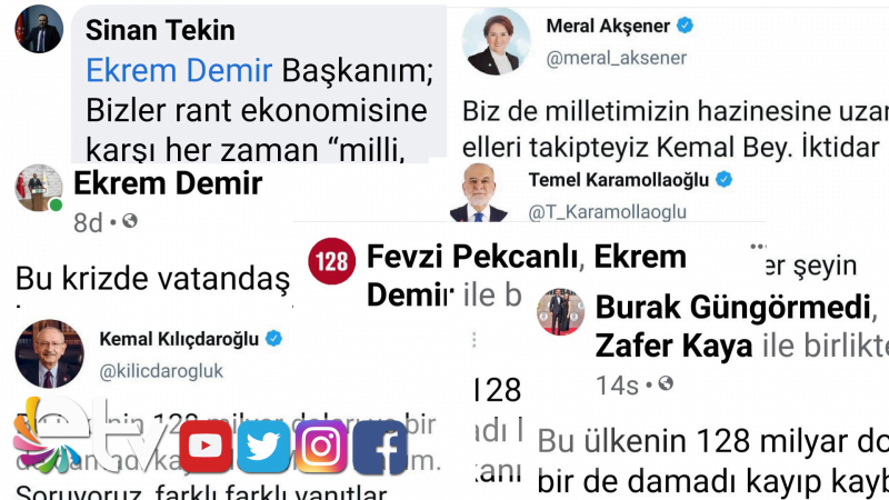 CHP İl Başkanı Fevzi Pekcanlı sosyal medya hesabından İYİ Parti İl Başkanı Ekrem Demir’i etiketleyerek, “Bu ülkenin 128 Milyar doları ve bir de damadı kayboldu Ekrem Başkanım. Soruyoruz farklı farklı yanıtlar alıyoruz, siz nerede olduklarını biliyor musunuz?” dedi.