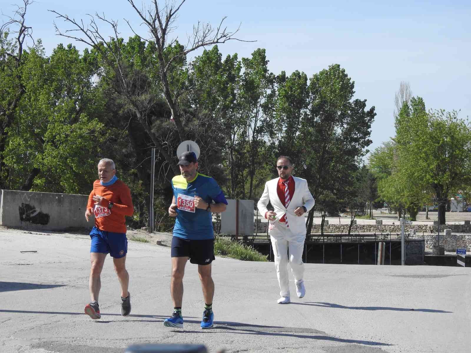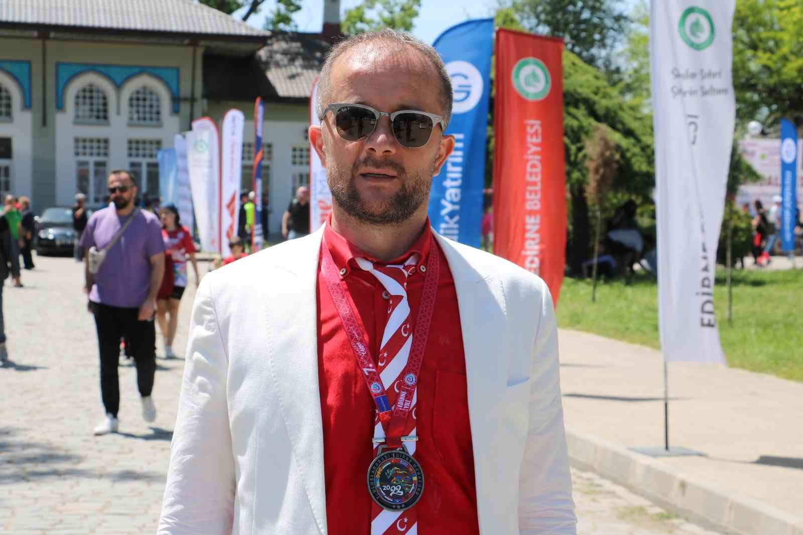 Maratona takım elbise ile katılan Bilal Gül, “Bu yıl 7. kez düzenlenen Edirne Maratonu’nda koştum.