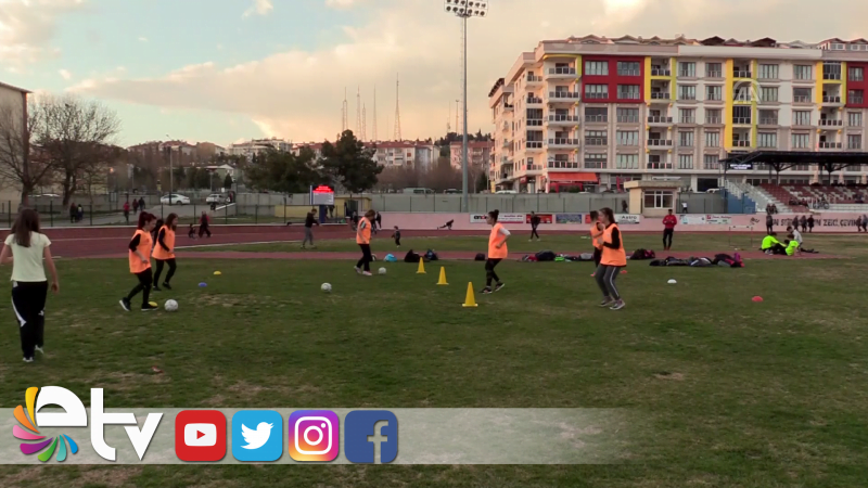 Arkadaşlarıyla idman sahasında buluşan Emine Aydın Özgür, başarılı bir turnuvayı sürdürmek amacıyla ısınma, pas ve şut denemeleri yapıyor.