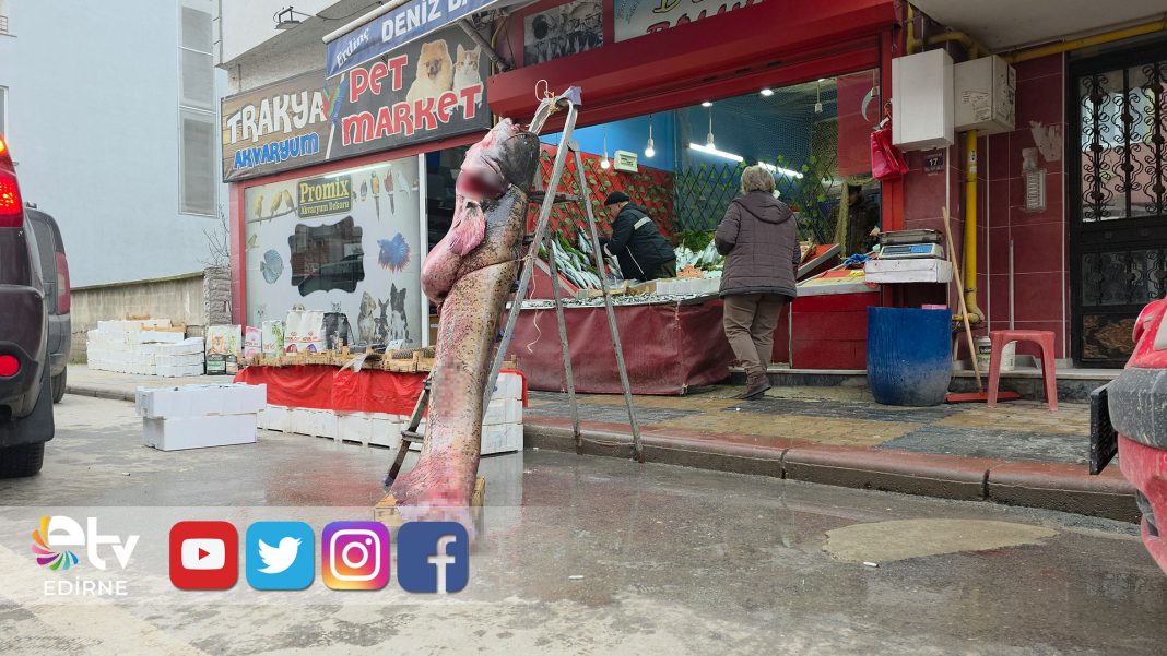 Edirne’de Meriç Nehri’ndeki taşkınlar ilginç görüntüler oluşturmaya devam ediyor. Suların çekilmeye başladığı bölgede karaya vuran 2 metre 40 santim uzunluğunda, 102 kiloluk dev yayın balığı görenleri şaşırttı.