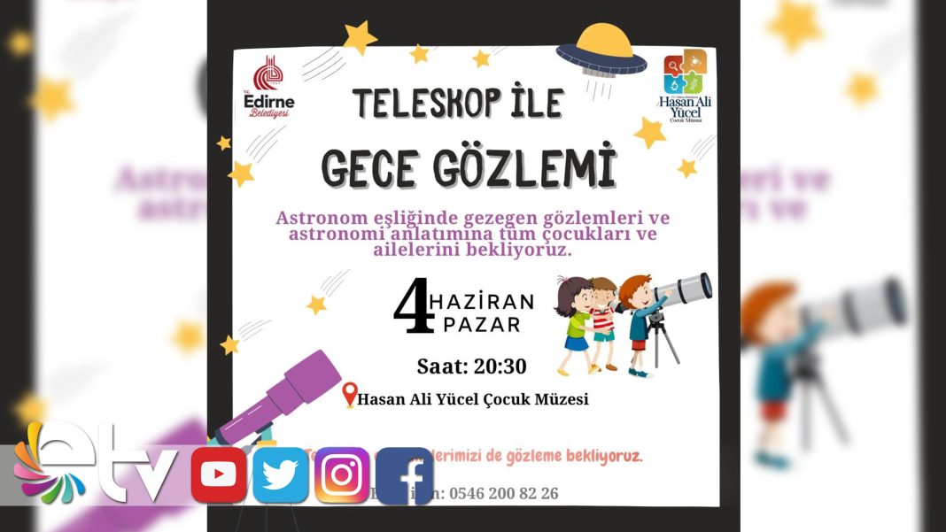 Edirne Belediyesi çocukların astronomi ve uzay dünyasına olan ilgisini arttırmak ve farkındalık oluşturmak amacıyla ‘Teleskop ile Gece Gözlemi’ etkinliği düzenliyor. 4 Haziran Pazar Günü 20.30’da Hasan Ali Yücel Çocuk Müzesi’nde gerçekleştirilecek olan etkinlikte çocuklar, astronomlar eşliğinde gezegen gözlemleri yapacak.