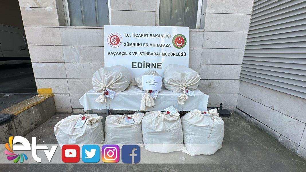 Edirne Gümrük Muhafaza Kaçakçılık ve İstihbarat Müdürlüğü ekipleri, yurda giriş yapmak üzere Kapıkule Gümrük sahasına giriş yapan bir minibüsü şüphe üzerine X-ray taramasına sevk etti. Araçta dedektör köpeği Jeff ile yapılan detaylı aramada televizyon ünitesi içerisinde bez parça ile sabitlenmiş halde 23 adet alüminyum folyoya sarılı şeffaf naylon paket bulundu. Paketlerde toplam 49 kilo 866 gram esrar maddesi olduğu tespit edildi.