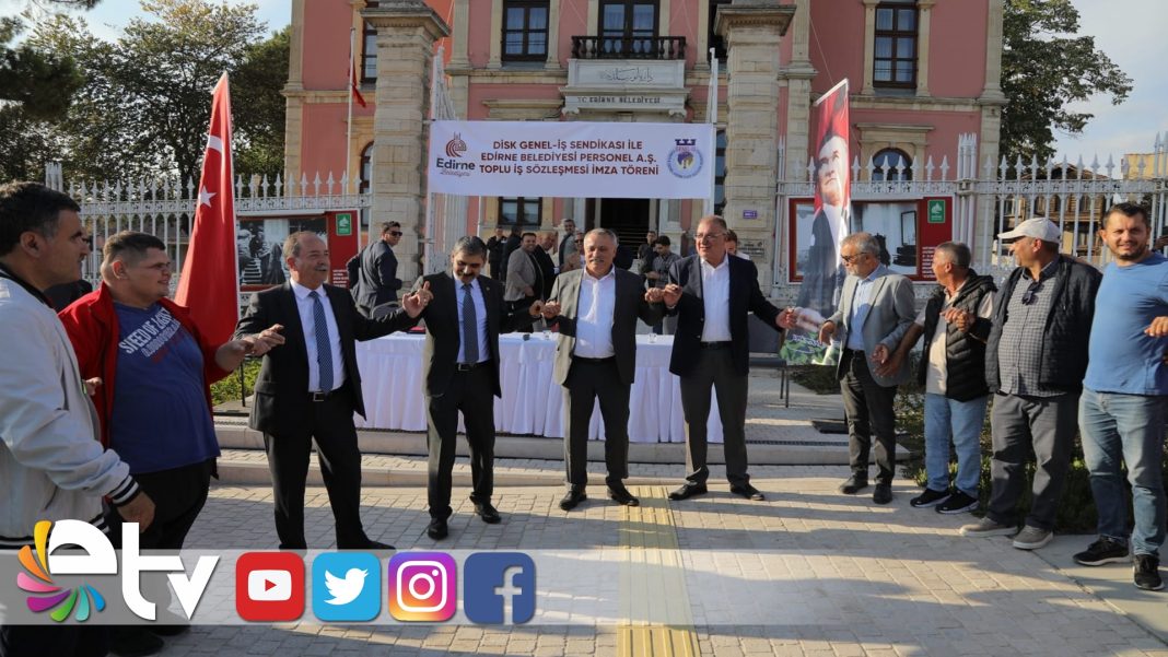 Edirne Belediyesi Personel A.Ş. ile Disk Genel İş Sendikası arasında Temmuz 2022 tarihinden geçerli olacak toplu iş sözleşmesi, Belediye önünde düzenlenen törenle imzalandı. Edirne Belediyesi’nde çalışan işçiler, zamlı maaşlarını davulla zurnayla kutladı.