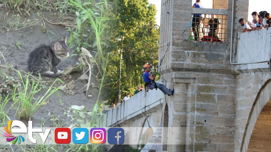 Edirne’de Tunca Nehri’nde mahsur kalan kedi, itfaiye ve AFAD ekiplerinin köprüden halat sarkarak nehre inmesiyle kurtarıldı.