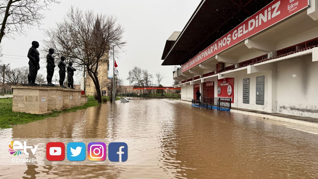 Edirne’de günlerdir etkili olan yağışın ardından Tunca Nehri taştı, Kırkpınar Yağlı Güreşleri’nin yapıldığı Sarayiçi Er Meydanı tamamen sular altında kaldı.