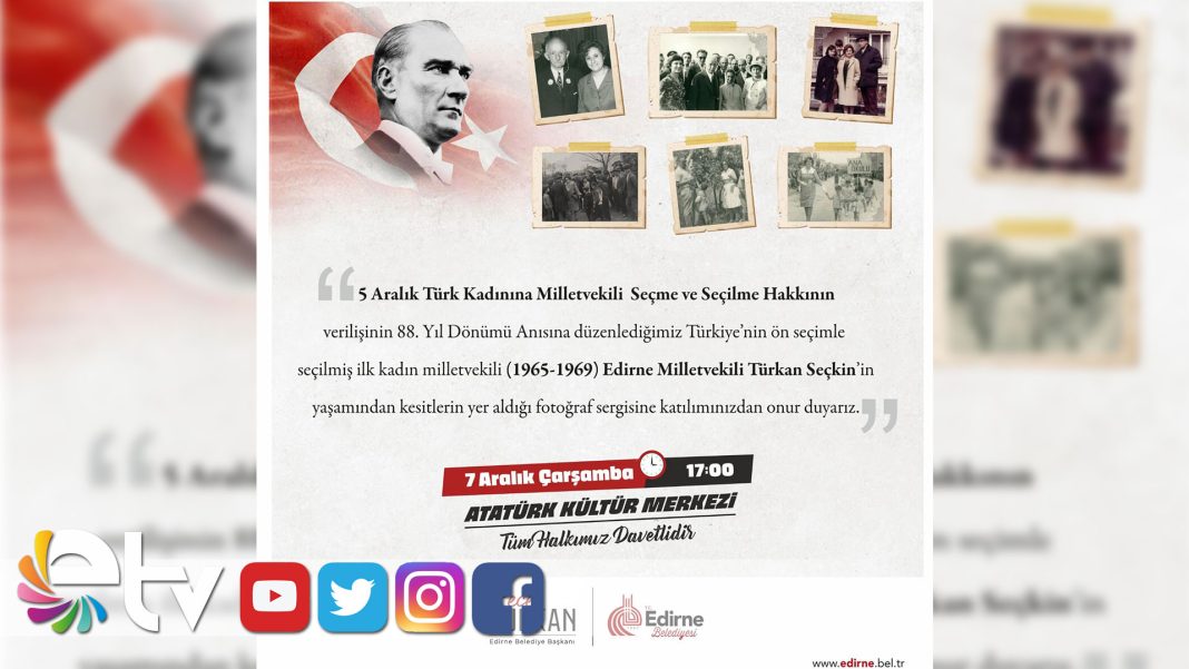 Edirne Belediye Başkanı Recep Gürkan 5 Aralık Türk Kadınına Seçme ve Seçilme Hakkının verilişinin 88. yıl dönümünde, Türkiye’de ön seçimle seçilmiş ilk kadın milletvekili olan Edirne Milletvekili Türkan Seçkin’in fotoğraflarla anılacağını belirterek, “Türkan Seçkin’i gençlerimizin ve kadınlarımızın daha yakından tanımasını sağlamak için yaşamından kesitlerin yer aldığı fotoğraf sergisi ile yaşamını anlattık.” dedi.