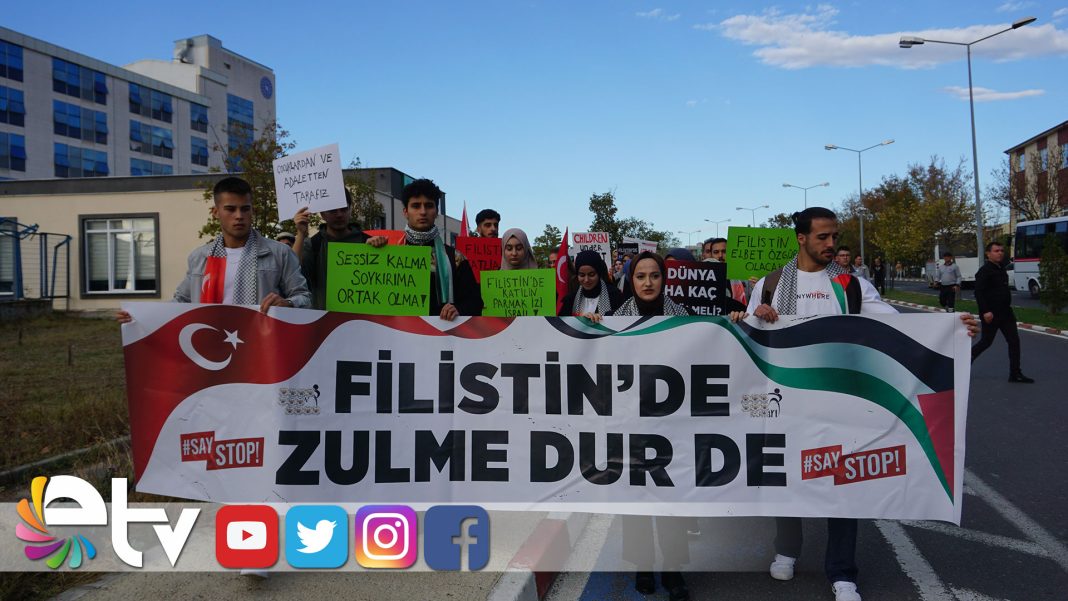Trakya Üniversitesi Balkan Yerleşkesindeki Genç Ofis önünde bir araya gelen öğrenciler, İsrail’in Gazze’ye yönelik saldırılarına tepki gösterdi. Ellerinde ‘Filistin’de Zulme Dur De’, ‘Savaş Değil Soykırım’, ‘Filistin Elbet Özgür Olacak’ yazılı pankartlar ile Türk ve Filistin bayrakları taşıyan öğrenciler, Genç Ofis önünden yaşam merkezine kadar sessiz yürüyüş gerçekleştirdi.