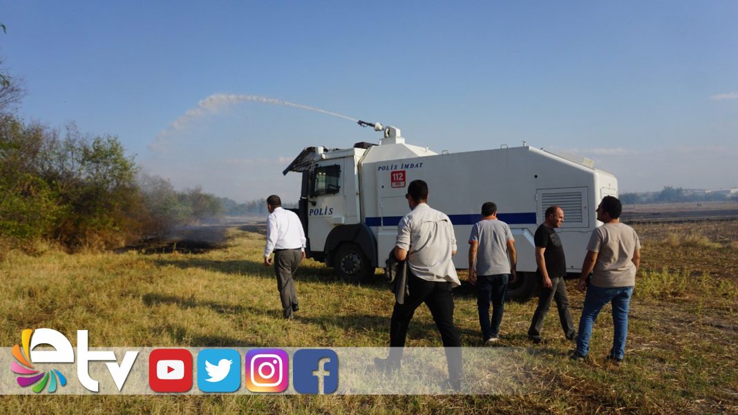 Edirne’de rüzgarın etkisiyle geniş alana yayılan anız yangınına, itfaiye ve orman işletme müdürlüğü araçlarının yanı sıra emniyete ait TOMA ile de müdahale edildi.
