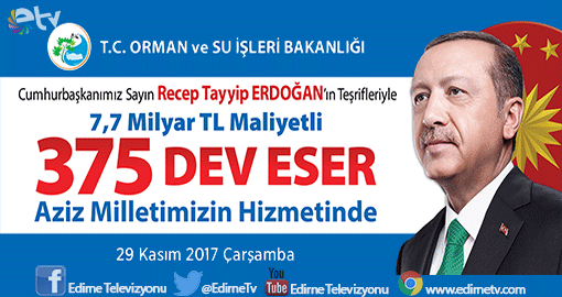 Orman ve Su İşleri Bakanlığı bir gelenek haline getirdiği toplu açılış merasimlerine bu yıl da devam ediyor. Bu çerçevede Orman ve Su İşleri Bakanlığı tarafından ülke genelinde yapımı tamamlanan, 7,7 milyar lira yatırım bedelli 375 eser hizmete alınacak. 29 Kasım Çarşamba günü Ankara’da Cumhurbaşkanı Recep Tayyip Erdoğan tarafından toplu olarak hizmete alınacak eserlerden Edirne de payını alacak.