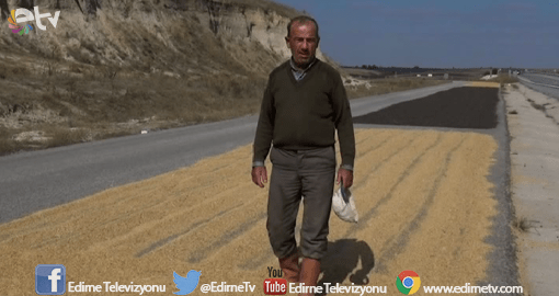 Edirneli çeltik üreticisi Sebahattin Dalkıran, hasadını yaptığı yaklaşık 3 ton çeltiği asfalt yolda kuruttuğunu söyledi.