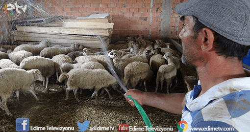 Edirne’nin Karaağaç Mahallesi’nde hayvancılık yapan Cesur Pakarda, mevsim normalleri üzerinde seyreden hava sıcaklıklarının koyunlarını etkilememesi için ağılının çatısını köpükle kaplarken, günün en sıcak saatlerindeyse hortumla su tutarak serinletmeye çalışıyor.
